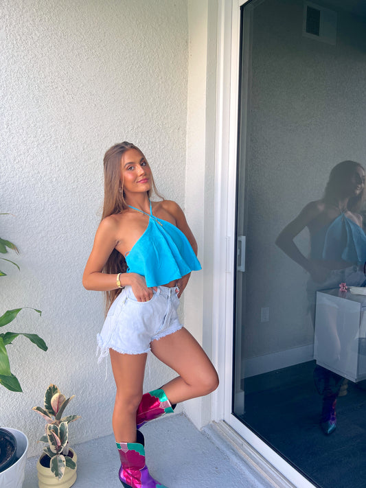 Abby Halter Neck Bow Tie Backless Top - Blue